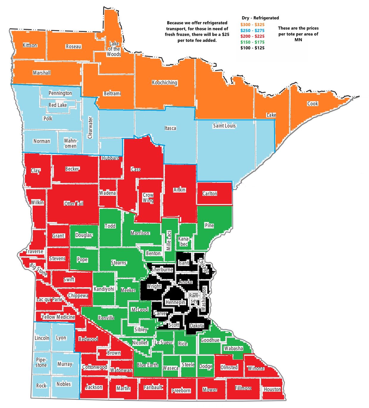 If there are local deliveries that need to be made within a county outside of the Metro (Black) area (for example, if you are in Itasca County (Blue Area)), and need to send products to your other facility in the same county. As long as you are sending at least 10 totes. We will only charge the Metro (Black) area fees. However, all other costs will be applied if you are sending totes outside your network or to another business customer or a testing facility.